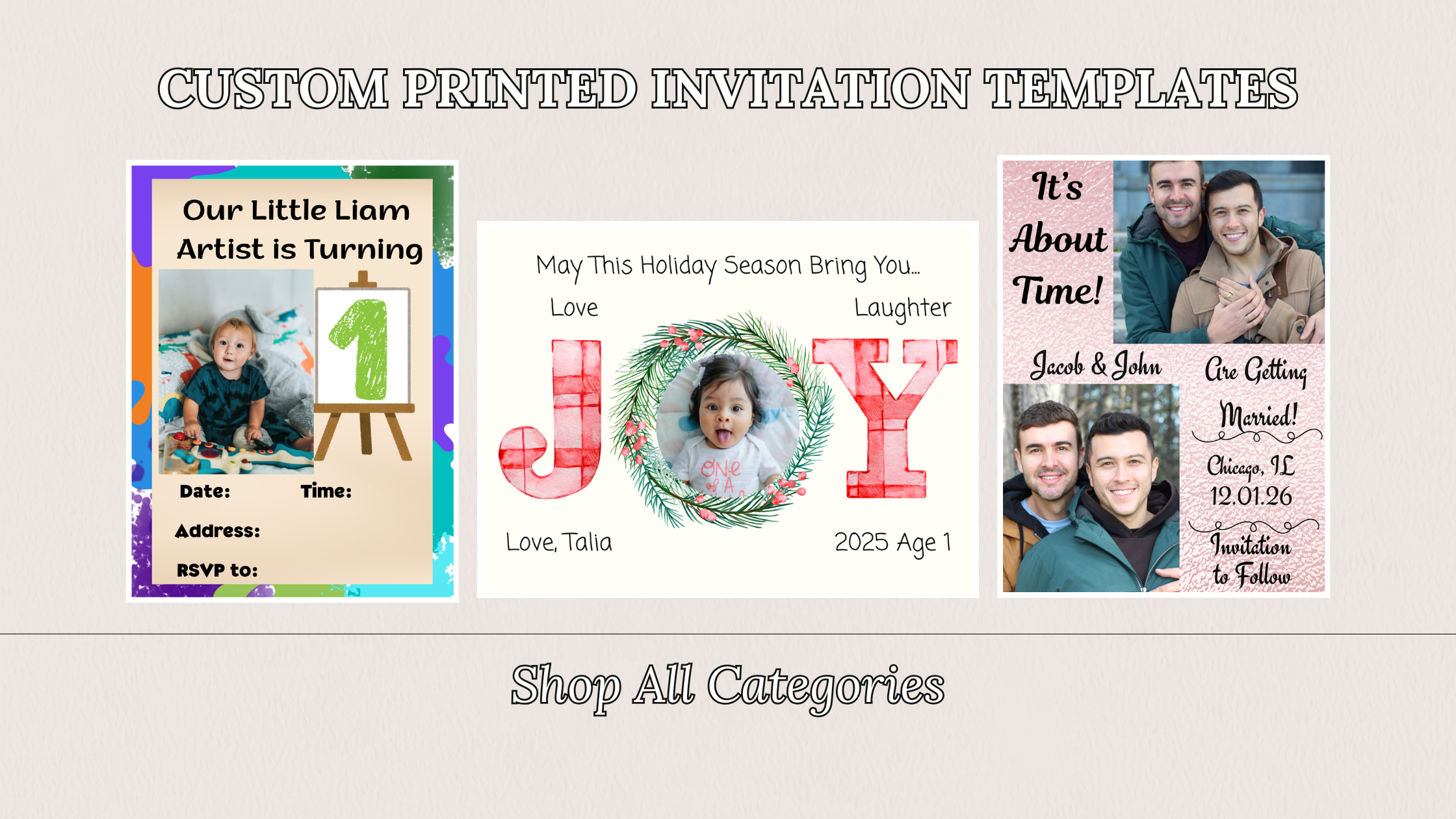 Create custom invitations for weddings, birthdays, baby showers, holidays, and more. Choose a template, personalize a photo, or upload your own design for a unique, high-quality finish.